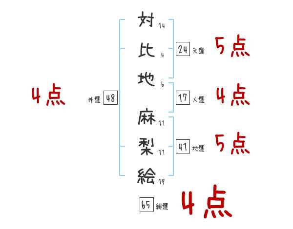 地運![]() | 対比地麻梨絵さんの地運は41画の5つ星!大志を抱き、目標に向かって実力を発揮し達成する。温和な性格。 個性を表す基礎的な運勢です。性格形成や対人関係、行動力など家庭環境に影響されます。主に誕生してから20歳くらいまでの若年期の運勢を表します。 |