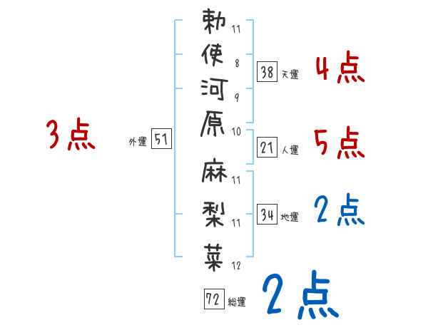 総運![]() | 勅使河原麻梨菜さんの総運は72画の2つ星!災難が多く不安定な生活にならないように注意。明暗のある人生かも。 あなたの人生を表す1番重要な運勢です。生涯を通じて影響する総合運となり、主に50歳以降の晩年期に影響を及ぼします。 |