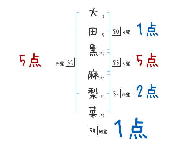 総運![]() | 大田黒麻梨菜さんの総運は54画の1つ星!トラブルが多いかも。周りをよく見て協調して過ごしましょう。 あなたの人生を表す1番重要な運勢です。生涯を通じて影響する総合運となり、主に50歳以降の晩年期に影響を及ぼします。 |