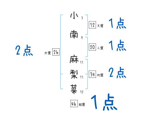 外運![]() | 小南麻梨菜さんの外運は26画の2つ星!波瀾万丈かも。信頼できる人を大事にしましょう。 生活面を象徴する運勢です。外部から受ける影響力を表し、結婚運、家庭運や職場、環境への順応性を表します。 |