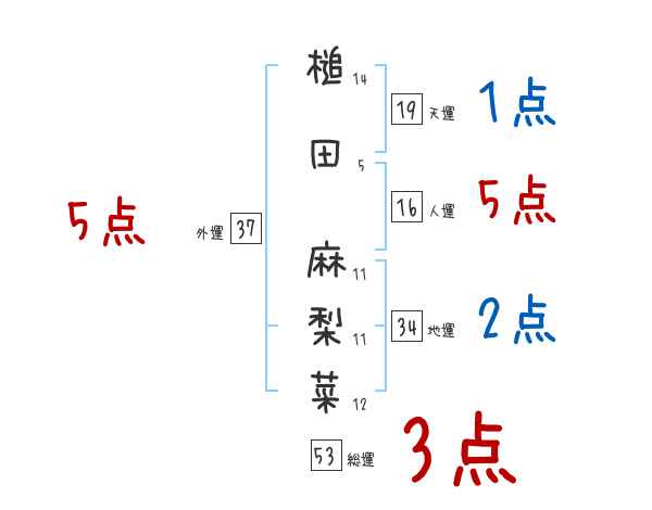 人運![]() | 槌田麻梨菜さんの人運は16画の5つ星!人望が厚く大きく発展する。逆転成功が見える。 性格や才能などを表す2番目に重要な運勢です。人間関係や協調性、社会的な成功に影響します。主に20歳から50歳ぐらいまでの中年期の運勢を表します。 |