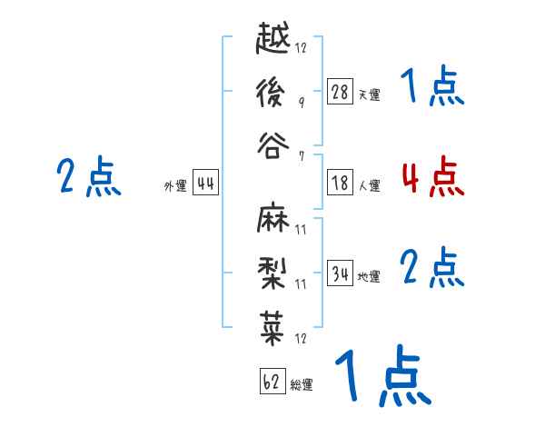 天運![]() | 越後谷麻梨菜さんの天運は28画の1つ星!家庭環境に注意。スポーツで活躍できる能力があるかも。 家系が持つ宿命的な運勢を表します。祖先から受け継いだ苗字ですので自分の力が及びません。家柄を象徴します。 |