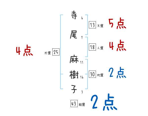 天運![]() | 寺尾麻樹子さんの天運は13画の5つ星!才能に恵まれ人気がある。名声を手に入れる。円満な人生。 家系が持つ宿命的な運勢を表します。祖先から受け継いだ苗字ですので自分の力が及びません。家柄を象徴します。 |