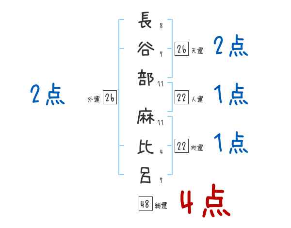 天運![]() | 長谷部麻比呂さんの天運は26画の2つ星!波瀾万丈かも。信頼できる人を大事にしましょう。 家系が持つ宿命的な運勢を表します。祖先から受け継いだ苗字ですので自分の力が及びません。家柄を象徴します。 |