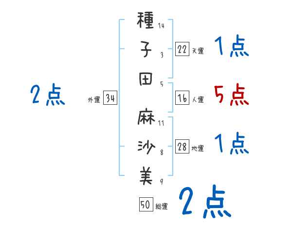 総運![]() | 種子田麻沙美さんの総運は50画の2つ星!浮き沈みが激しく不安定。しりすぼみに衰退しやすいので注意しましょう。 あなたの人生を表す1番重要な運勢です。生涯を通じて影響する総合運となり、主に50歳以降の晩年期に影響を及ぼします。 |