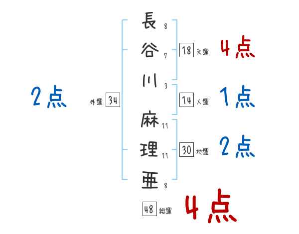 天運![]() | 長谷川麻理亜さんの天運は18画の4つ星!情熱的で剛気。忍耐力があり信頼される。 家系が持つ宿命的な運勢を表します。祖先から受け継いだ苗字ですので自分の力が及びません。家柄を象徴します。 |