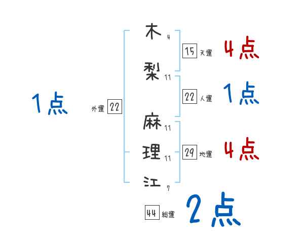 総運![]() | 木梨麻理江さんの総運は44画の2つ星!誠実で慎重な性格。物事を考えすぎないように注意しましょう。 あなたの人生を表す1番重要な運勢です。生涯を通じて影響する総合運となり、主に50歳以降の晩年期に影響を及ぼします。 |