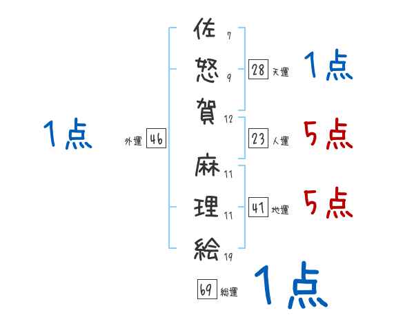 人運![]() | 佐怒賀麻理絵さんの人運は23画の5つ星!想像力に優れ活力がある。一代で成功し名誉を手に入れる。 性格や才能などを表す2番目に重要な運勢です。人間関係や協調性、社会的な成功に影響します。主に20歳から50歳ぐらいまでの中年期の運勢を表します。 |
