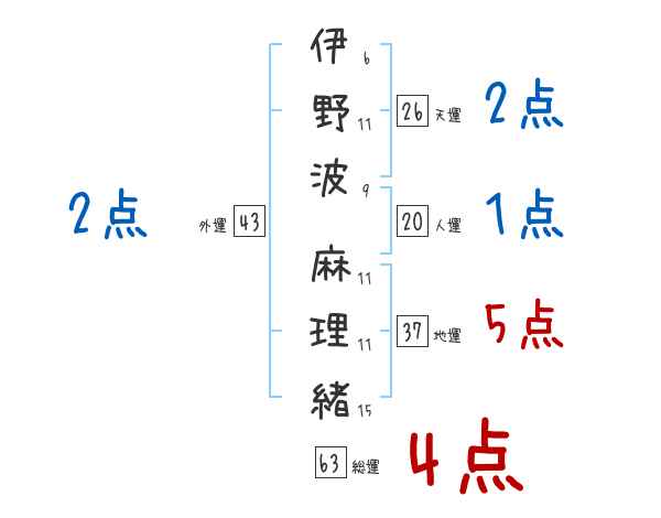 天運![]() | 伊野波麻理緒さんの天運は26画の2つ星!波瀾万丈かも。信頼できる人を大事にしましょう。 家系が持つ宿命的な運勢を表します。祖先から受け継いだ苗字ですので自分の力が及びません。家柄を象徴します。 |
