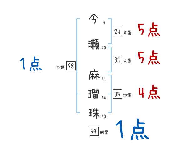 天運![]() | 今瀬麻瑠珠さんの天運は24画の5つ星!家庭運が良く順調な人生。金運にも恵まれる。 家系が持つ宿命的な運勢を表します。祖先から受け継いだ苗字ですので自分の力が及びません。家柄を象徴します。 |