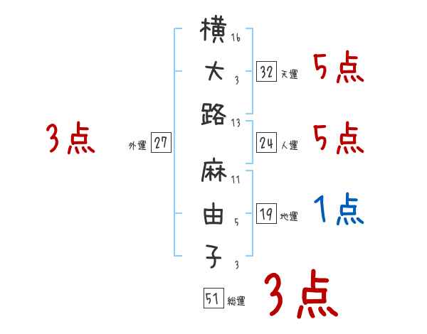 総運![]() | 横大路麻由子さんの総運は51画の3つ星!変化が激しく、危険に注意。堅実な性格。 あなたの人生を表す1番重要な運勢です。生涯を通じて影響する総合運となり、主に50歳以降の晩年期に影響を及ぼします。 |