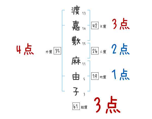外運![]() | 渡嘉敷麻由子さんの外運は35画の4つ星!温厚な性格で感受性が高い。穏和な性格で人望が厚い。 生活面を象徴する運勢です。外部から受ける影響力を表し、結婚運、家庭運や職場、環境への順応性を表します。 |