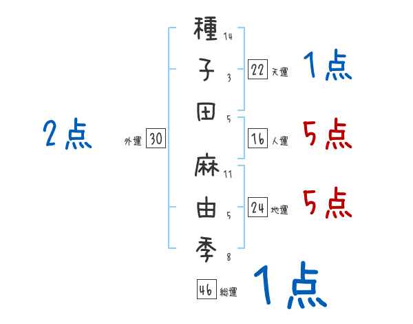 人運![]() | 種子田麻由季さんの人運は16画の5つ星!人望が厚く大きく発展する。逆転成功が見える。 性格や才能などを表す2番目に重要な運勢です。人間関係や協調性、社会的な成功に影響します。主に20歳から50歳ぐらいまでの中年期の運勢を表します。 |