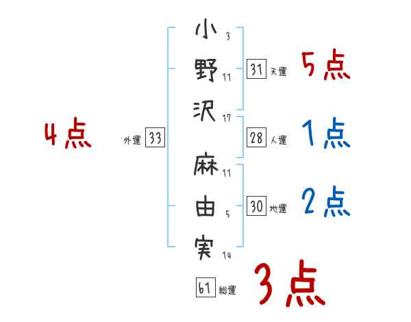 外運![]() | 小野沢麻由実さんの外運は33画の4つ星!権力志向でプライドが高い。勇気があり運を切り開き成功する。 生活面を象徴する運勢です。外部から受ける影響力を表し、結婚運、家庭運や職場、環境への順応性を表します。 |