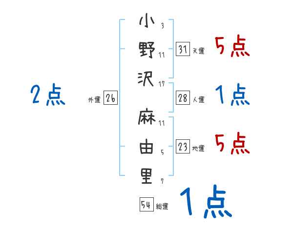 外運![]() | 小野沢麻由里さんの外運は26画の2つ星!波瀾万丈かも。信頼できる人を大事にしましょう。 生活面を象徴する運勢です。外部から受ける影響力を表し、結婚運、家庭運や職場、環境への順応性を表します。 |