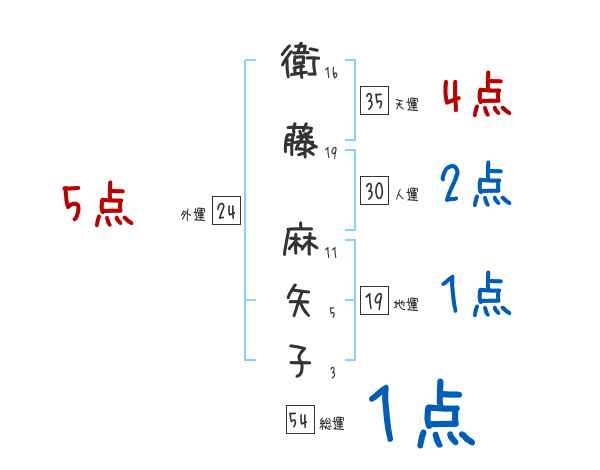 外運![]() | 衛藤麻矢子さんの外運は24画の5つ星!家庭運が良く順調な人生。金運にも恵まれる。 生活面を象徴する運勢です。外部から受ける影響力を表し、結婚運、家庭運や職場、環境への順応性を表します。 |