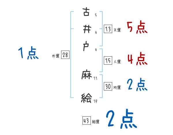 外運![]() | 古井戸麻絵さんの外運は28画の1つ星!家庭環境に注意。スポーツで活躍できる能力があるかも。 生活面を象徴する運勢です。外部から受ける影響力を表し、結婚運、家庭運や職場、環境への順応性を表します。 |