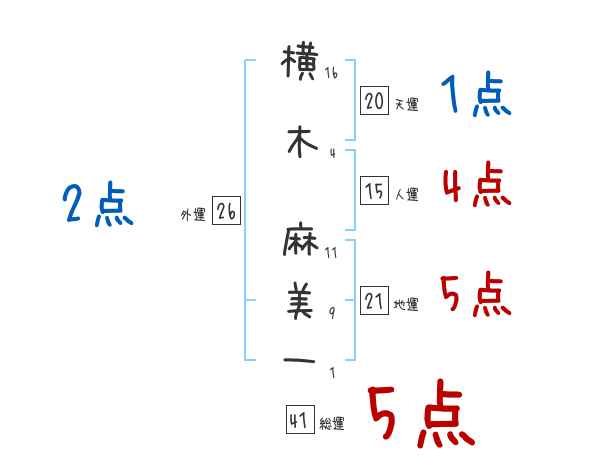 外運![]() | 横木麻美一さんの外運は26画の2つ星!波瀾万丈かも。信頼できる人を大事にしましょう。 生活面を象徴する運勢です。外部から受ける影響力を表し、結婚運、家庭運や職場、環境への順応性を表します。 |
