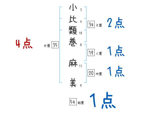 外運![]() | 小比類巻麻美さんの外運は35画の4つ星!温厚な性格で感受性が高い。穏和な性格で人望が厚い。 生活面を象徴する運勢です。外部から受ける影響力を表し、結婚運、家庭運や職場、環境への順応性を表します。 |