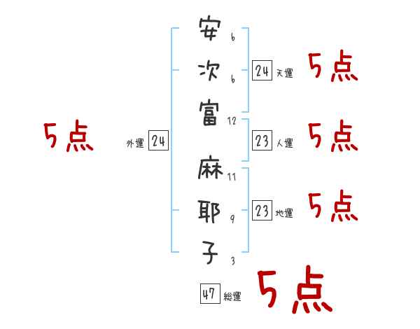 天運![]() | 安次富麻耶子さんの天運は24画の5つ星!家庭運が良く順調な人生。金運にも恵まれる。 家系が持つ宿命的な運勢を表します。祖先から受け継いだ苗字ですので自分の力が及びません。家柄を象徴します。 |