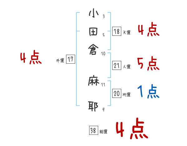 天運![]() | 小田倉麻耶さんの天運は18画の4つ星!情熱的で剛気。忍耐力があり信頼される。 家系が持つ宿命的な運勢を表します。祖先から受け継いだ苗字ですので自分の力が及びません。家柄を象徴します。 |