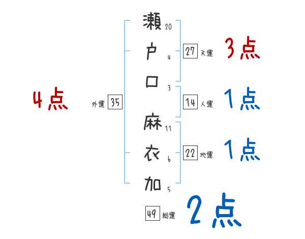 外運![]() | 瀬戸口麻衣加さんの外運は35画の4つ星!温厚な性格で感受性が高い。穏和な性格で人望が厚い。 生活面を象徴する運勢です。外部から受ける影響力を表し、結婚運、家庭運や職場、環境への順応性を表します。 |