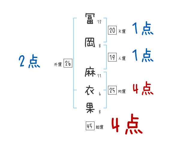 外運![]() | 冨岡麻衣果さんの外運は26画の2つ星!波瀾万丈かも。信頼できる人を大事にしましょう。 生活面を象徴する運勢です。外部から受ける影響力を表し、結婚運、家庭運や職場、環境への順応性を表します。 |