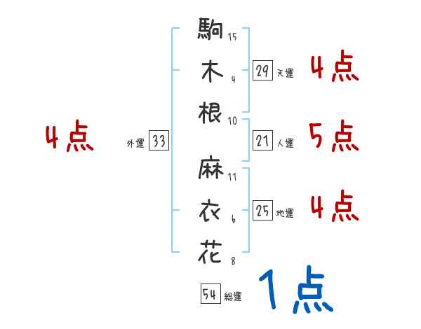 外運![]() | 駒木根麻衣花さんの外運は33画の4つ星!権力志向でプライドが高い。勇気があり運を切り開き成功する。 生活面を象徴する運勢です。外部から受ける影響力を表し、結婚運、家庭運や職場、環境への順応性を表します。 |