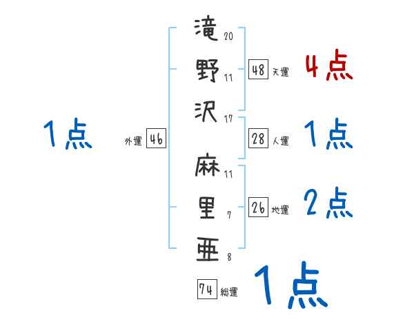 総運![]() | 滝野沢麻里亜さんの総運は74画の1つ星!無気力で怠惰な生活送りがち。規則正しい生活を送るよう気をつけましょう。 あなたの人生を表す1番重要な運勢です。生涯を通じて影響する総合運となり、主に50歳以降の晩年期に影響を及ぼします。 |