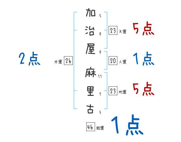 天運![]() | 加治屋麻里古さんの天運は23画の5つ星!想像力に優れ活力がある。一代で成功し名誉を手に入れる。 家系が持つ宿命的な運勢を表します。祖先から受け継いだ苗字ですので自分の力が及びません。家柄を象徴します。 |