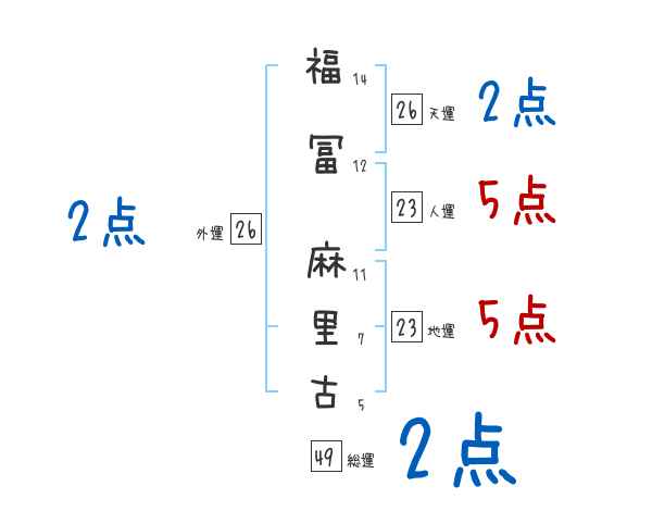 人運![]() | 福冨麻里古さんの人運は23画の5つ星!想像力に優れ活力がある。一代で成功し名誉を手に入れる。 性格や才能などを表す2番目に重要な運勢です。人間関係や協調性、社会的な成功に影響します。主に20歳から50歳ぐらいまでの中年期の運勢を表します。 |