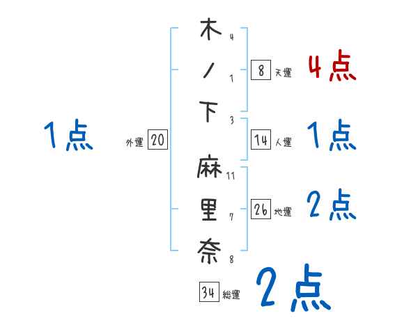 天運![]() | 木ノ下麻里奈さんの天運は8画の4つ星!勤勉家。根気強く努力し成功する。忍耐力がある。 家系が持つ宿命的な運勢を表します。祖先から受け継いだ苗字ですので自分の力が及びません。家柄を象徴します。 |