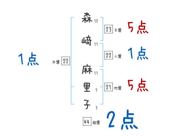 外運![]() | 森﨑麻里子さんの外運は22画の1つ星!努力することが苦手ないっぽう手先が器用。芸術性にも優れる。 生活面を象徴する運勢です。外部から受ける影響力を表し、結婚運、家庭運や職場、環境への順応性を表します。 |