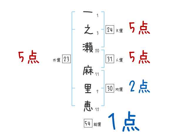 総運![]() | 一之瀬麻里恵さんの総運は54画の1つ星!トラブルが多いかも。周りをよく見て協調して過ごしましょう。 あなたの人生を表す1番重要な運勢です。生涯を通じて影響する総合運となり、主に50歳以降の晩年期に影響を及ぼします。 |