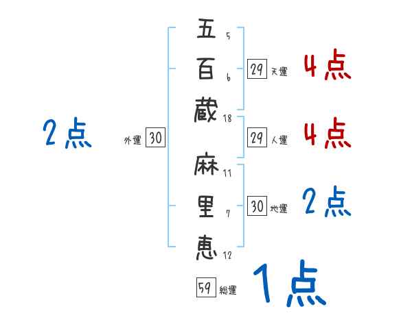天運![]() | 五百蔵麻里恵さんの天運は29画の4つ星!完全主義で才能がある。厳格な心の持ち主。 家系が持つ宿命的な運勢を表します。祖先から受け継いだ苗字ですので自分の力が及びません。家柄を象徴します。 |
