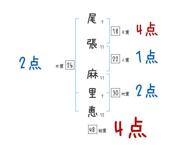 天運![]() | 尾張麻里恵さんの天運は18画の4つ星!情熱的で剛気。忍耐力があり信頼される。 家系が持つ宿命的な運勢を表します。祖先から受け継いだ苗字ですので自分の力が及びません。家柄を象徴します。 |