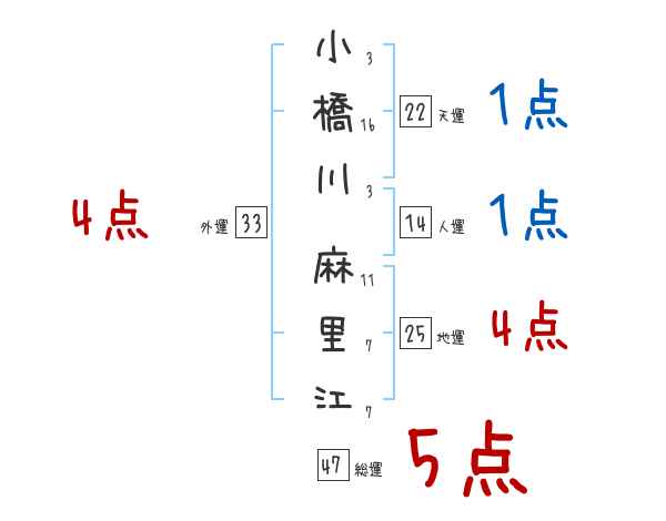 総運![]() | 小橋川麻里江さんの総運は47画の5つ星!実力が開花し発展する円満な人生。財に恵まれる。 あなたの人生を表す1番重要な運勢です。生涯を通じて影響する総合運となり、主に50歳以降の晩年期に影響を及ぼします。 |