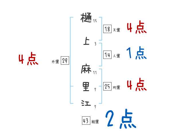 天運![]() | 樋上麻里江さんの天運は18画の4つ星!情熱的で剛気。忍耐力があり信頼される。 家系が持つ宿命的な運勢を表します。祖先から受け継いだ苗字ですので自分の力が及びません。家柄を象徴します。 |
