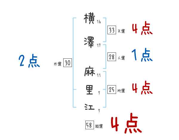 天運![]() | 横澤麻里江さんの天運は33画の4つ星!権力志向でプライドが高い。勇気があり運を切り開き成功する。 家系が持つ宿命的な運勢を表します。祖先から受け継いだ苗字ですので自分の力が及びません。家柄を象徴します。 |