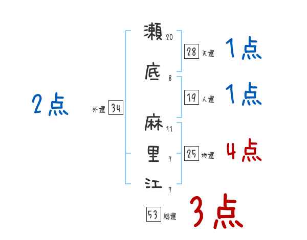総運![]() | 瀬底麻里江さんの総運は53画の3つ星!やや見栄っ張りで虚栄心がある。散財に注意。 あなたの人生を表す1番重要な運勢です。生涯を通じて影響する総合運となり、主に50歳以降の晩年期に影響を及ぼします。 |