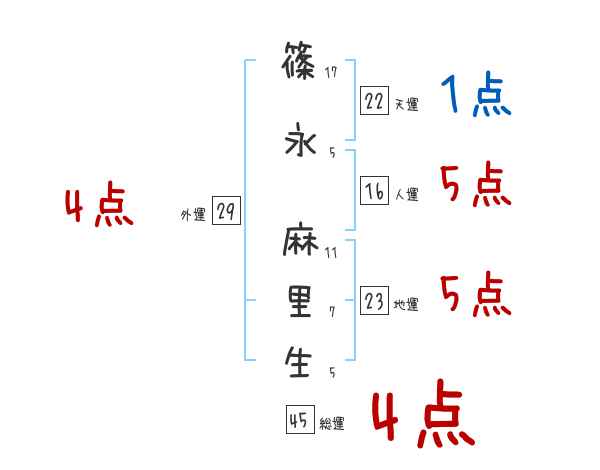 外運![]() | 篠永麻里生さんの外運は29画の4つ星!完全主義で才能がある。厳格な心の持ち主。 生活面を象徴する運勢です。外部から受ける影響力を表し、結婚運、家庭運や職場、環境への順応性を表します。 |