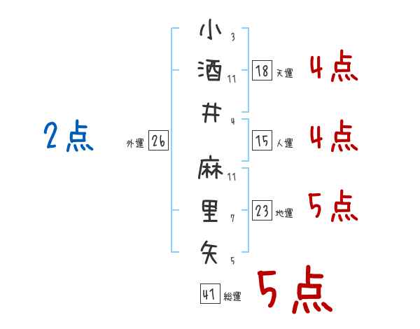 外運![]() | 小酒井麻里矢さんの外運は26画の2つ星!波瀾万丈かも。信頼できる人を大事にしましょう。 生活面を象徴する運勢です。外部から受ける影響力を表し、結婚運、家庭運や職場、環境への順応性を表します。 |