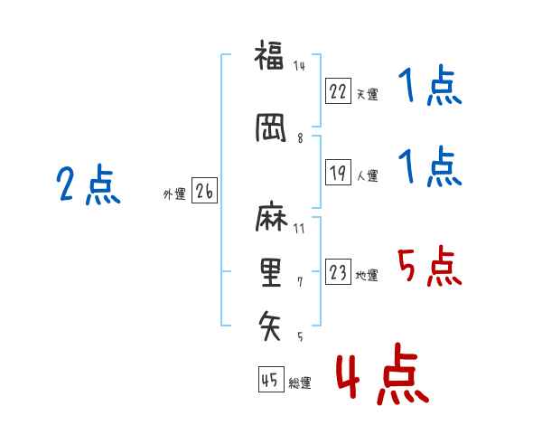 天運![]() | 福岡麻里矢さんの天運は22画の1つ星!努力することが苦手ないっぽう手先が器用。芸術性にも優れる。 家系が持つ宿命的な運勢を表します。祖先から受け継いだ苗字ですので自分の力が及びません。家柄を象徴します。 |