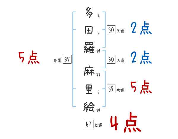 天運![]() | 多田羅麻里絵さんの天運は30画の2つ星!浮き沈みの激しさに注意しましょう。 家系が持つ宿命的な運勢を表します。祖先から受け継いだ苗字ですので自分の力が及びません。家柄を象徴します。 |