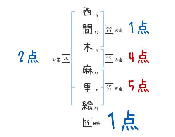 外運![]() | 西間木麻里絵さんの外運は44画の2つ星!誠実で慎重な性格。物事を考えすぎないように注意しましょう。 生活面を象徴する運勢です。外部から受ける影響力を表し、結婚運、家庭運や職場、環境への順応性を表します。 |