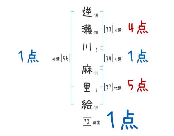 天運![]() | 逆瀬川麻里絵さんの天運は33画の4つ星!権力志向でプライドが高い。勇気があり運を切り開き成功する。 家系が持つ宿命的な運勢を表します。祖先から受け継いだ苗字ですので自分の力が及びません。家柄を象徴します。 |