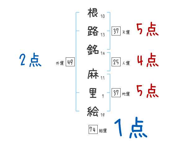 総運![]() | 根路銘麻里絵さんの総運は74画の1つ星!無気力で怠惰な生活送りがち。規則正しい生活を送るよう気をつけましょう。 あなたの人生を表す1番重要な運勢です。生涯を通じて影響する総合運となり、主に50歳以降の晩年期に影響を及ぼします。 |