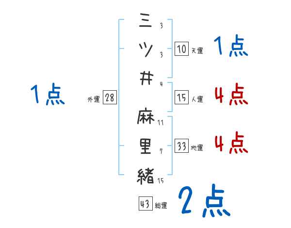 天運![]() | 三ツ井麻里緒さんの天運は10画の1つ星!不安を感じやすい傾向。ストレスを抱えないように注意しましょう。 家系が持つ宿命的な運勢を表します。祖先から受け継いだ苗字ですので自分の力が及びません。家柄を象徴します。 |