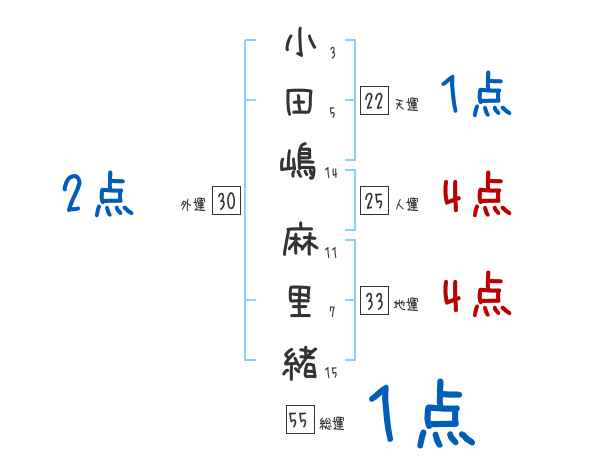 天運![]() | 小田嶋麻里緒さんの天運は22画の1つ星!努力することが苦手ないっぽう手先が器用。芸術性にも優れる。 家系が持つ宿命的な運勢を表します。祖先から受け継いだ苗字ですので自分の力が及びません。家柄を象徴します。 |