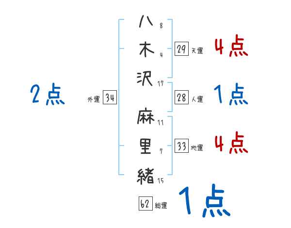 天運![]() | 八木沢麻里緒さんの天運は29画の4つ星!完全主義で才能がある。厳格な心の持ち主。 家系が持つ宿命的な運勢を表します。祖先から受け継いだ苗字ですので自分の力が及びません。家柄を象徴します。 |